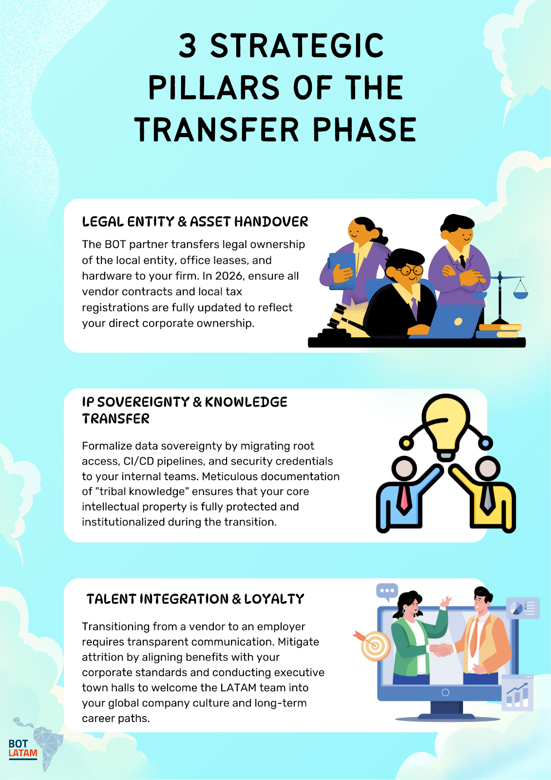 If your BOT partner has established a physical office or "Center of Excellence" in a hub like Medellín, Mexico City, or Buenos Aires, the transfer includes the assignment of leases, security protocols, and hardware assets.